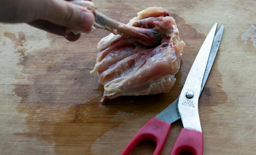 4、把鸡肉部分翻过来,再用剪刀把剩余的连接部分剪断。