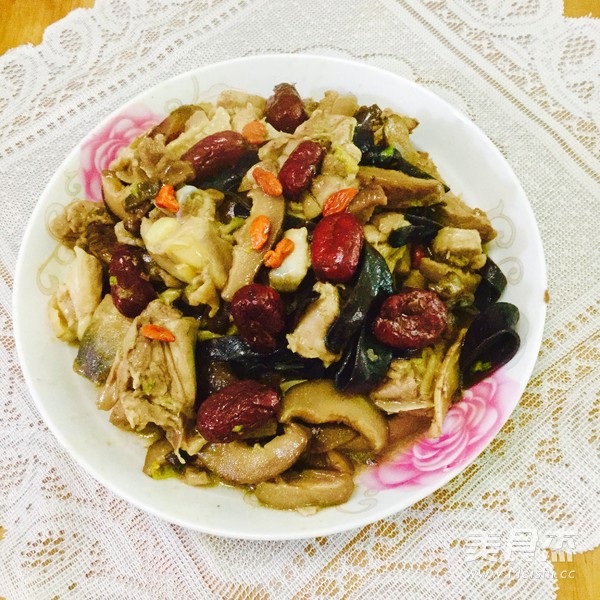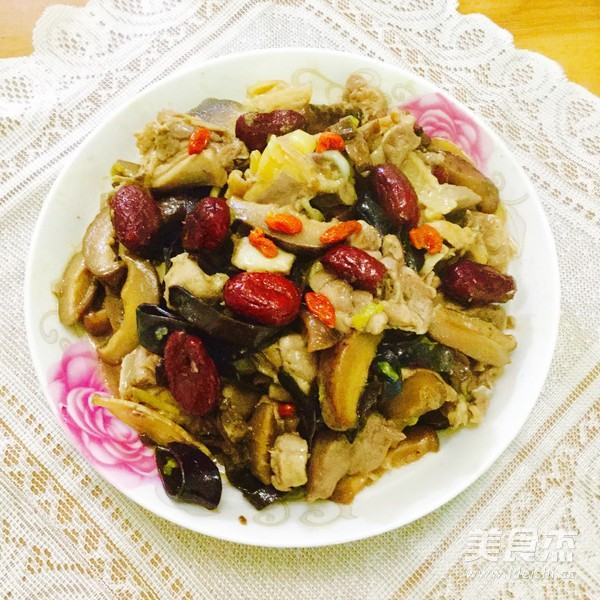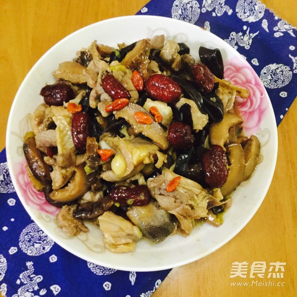 鸡肉300克 冬菇15克 木耳10克 姜5克 红枣5克 杞子3克