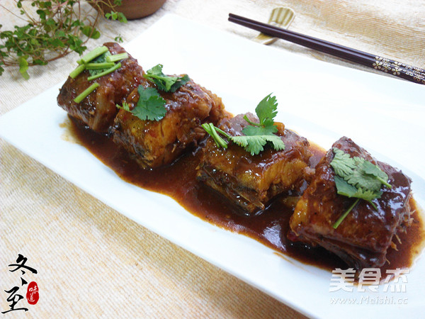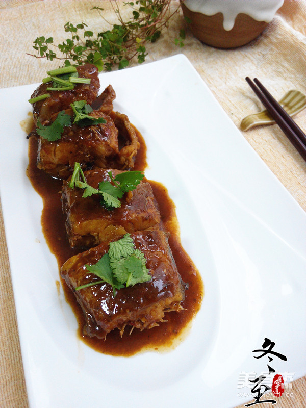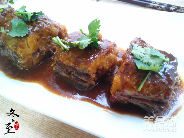 5.待剩少许汤汁时,将鱼段盛在盘内,将水淀粉淋入剩下的汤汁内,加热至粘稠,浇在鱼段上,放上香菜段即可