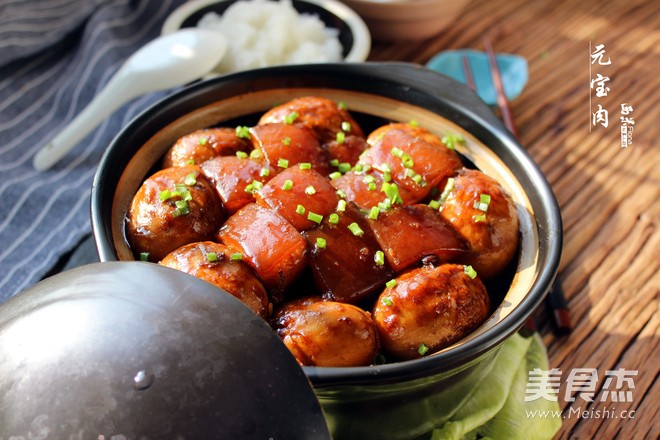 “元宝肉”是用鸡蛋和猪五花肉烧制而成。湖北人过年欢度春节时,全家老幼团聚在一起,在农历腊月三十晚上吃团年饭的家宴上,大家都喜欢吃这个菜,以示在新的一年里财源茂盛,富贵吉祥,万事如意。