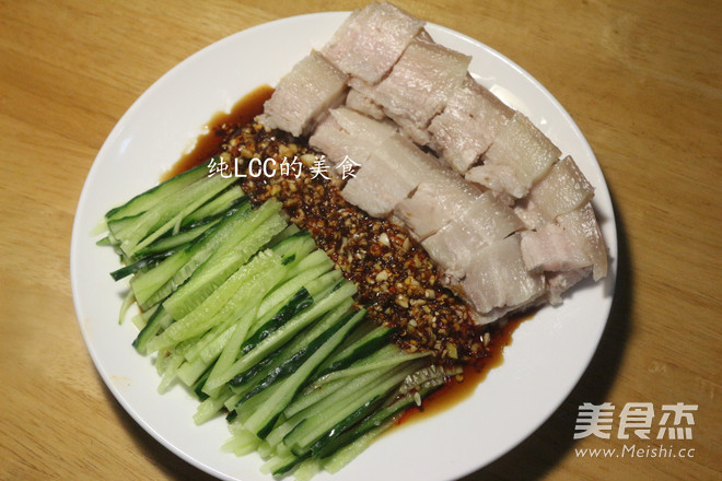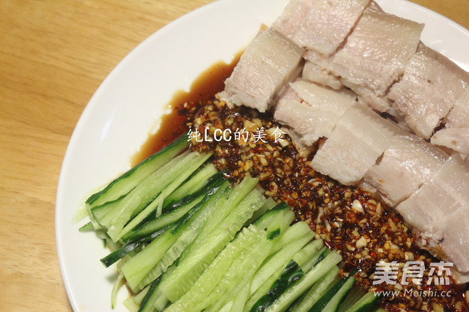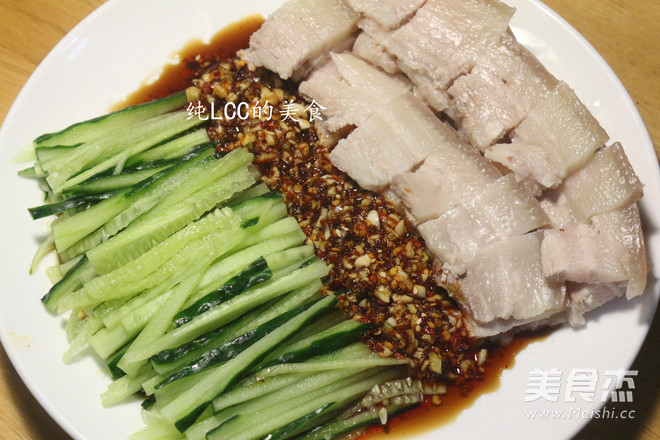 7.将酱料倒入切好的白肉和青瓜的中间即可