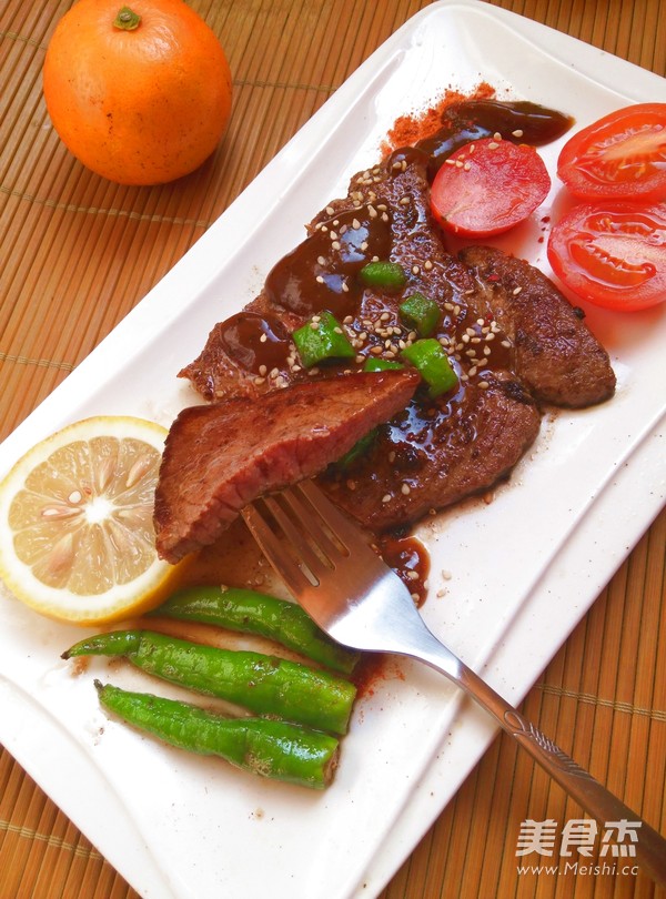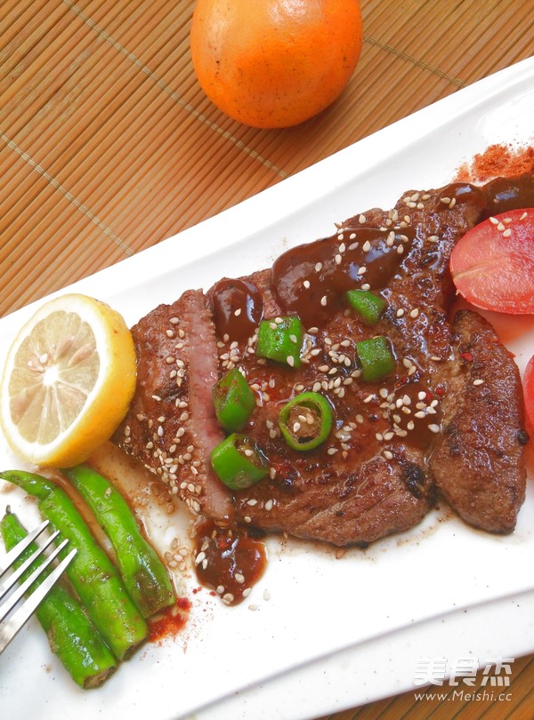 7. 牛排装盘,放尖椒,柠檬片和小番茄(切半)洒上熟白芝麻,辣椒粉和黑椒汁(是买来配好的)。
