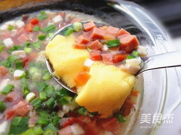 内酯豆腐100克 胡萝卜1根 鸡蛋2个 香菇10克 豌豆(鲜)30克 火腿肠50克