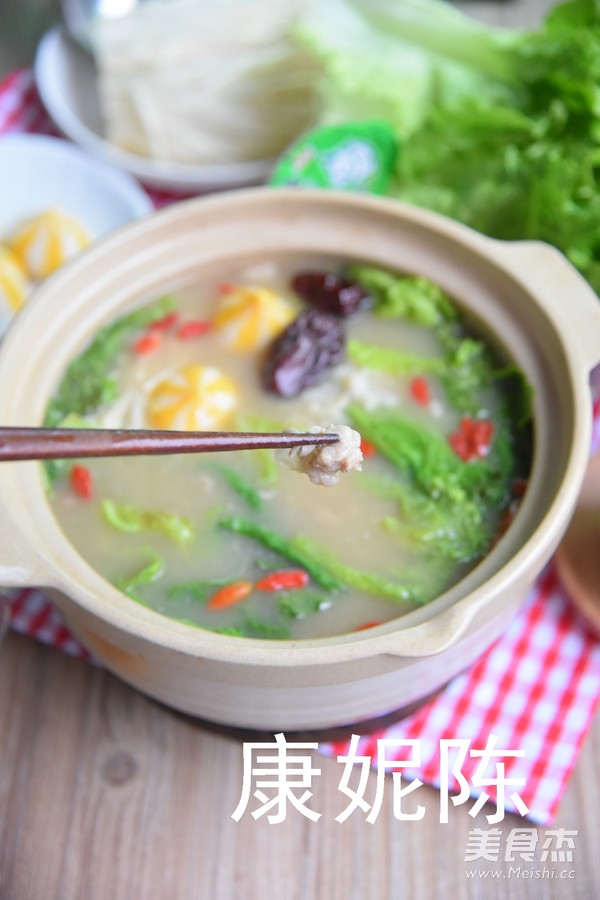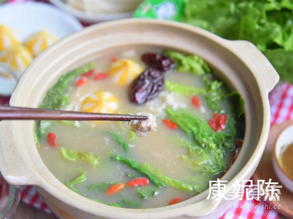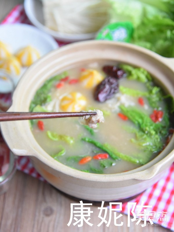 姜2片 红枣4颗 当归2片 枸杞20克 金针菇250克 羊肉300克 生菜600克 肉丸300克 浓汤宝1颗