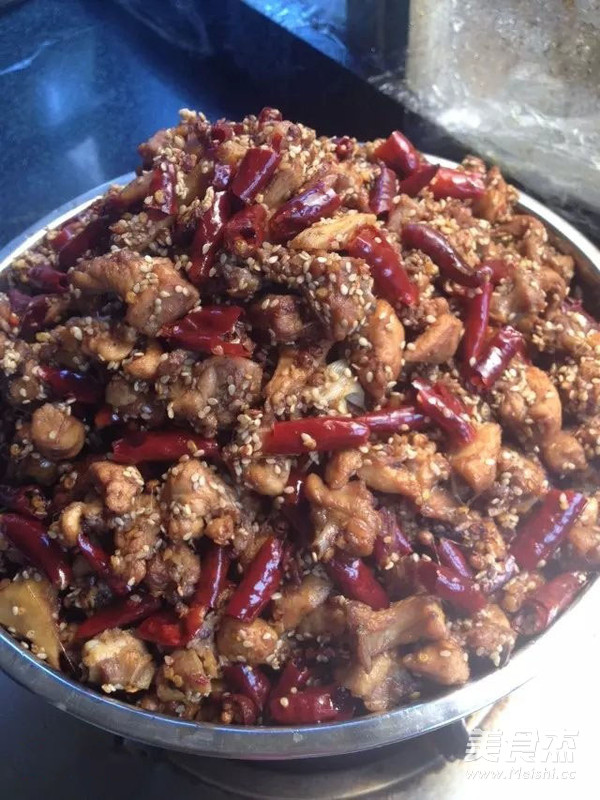 8. 大概30时分钟后,见兔肉颜色变深,肉质紧缩无水份时,加入白芝麻翻炒均匀,出锅,冷却之后方可食用。