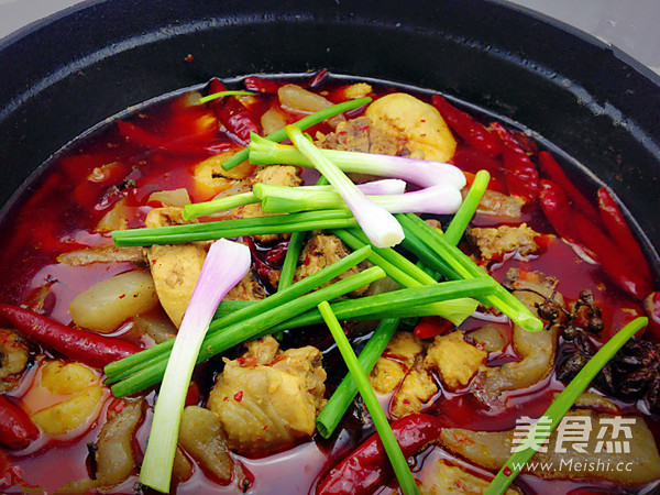 8.鸡肉都耙了后,就可以把之前除水过后的魔芋放进去了,再烧制10分钟就可以起锅了,起锅之后,上面放上葱段即可