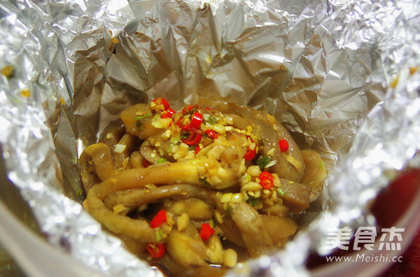 5. 取一个稍大一点的碗,铺上锡纸,将拌好的茄子小心的放进去,然后包好放进烤盘(不要包太紧),确保锡纸不要破掉