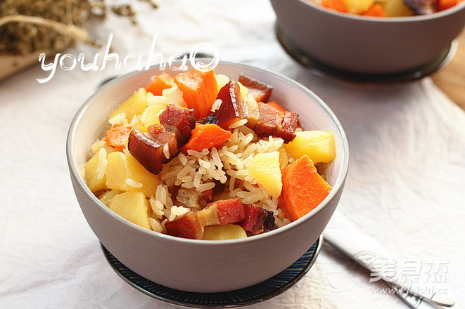 2.准备大米和其他材料;胡萝卜、土豆去皮洗净切丁,蒸好的腊肉切片