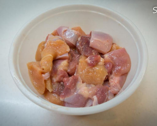 3、把鸡肉加入盐,米酒,太白粉略为腌过。
