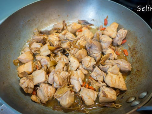 5、放入作法3的鸡肉翻炒,炒至鸡表面微焦,加入米酒、枸杞续炒,再斟酌以盐调味。