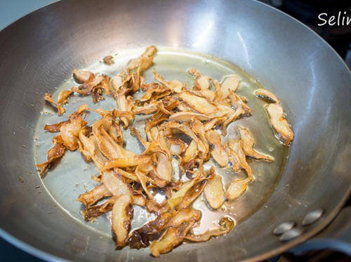 4、取锅倒入苦茶油爆香姜片,待姜片呈干扁状。