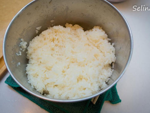 2、糯米加水放入电锅煮熟后略为闷过再取出(外锅放1杯水)。