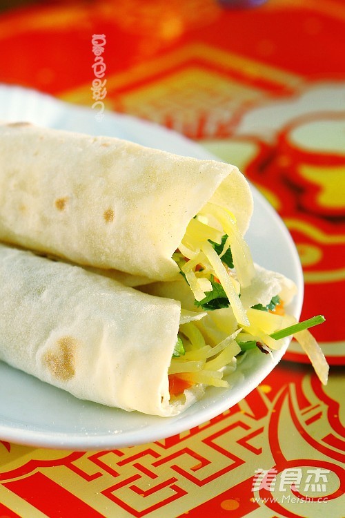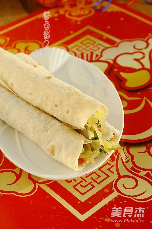 东北的卷饼里一般都喜欢包些炒土豆丝、韭菜、绿豆芽、肉丝、生大葱、酱或者生菜等等搭配着吃。我家也特爱吃春饼卷菜。因为春饼的面香和劲道。而且卷菜里边也会放些大葱、炸酱、肉丝、土豆丝、香菜等配菜。每次烙春饼都会多做一些,吃到停不住口的大有人在:)