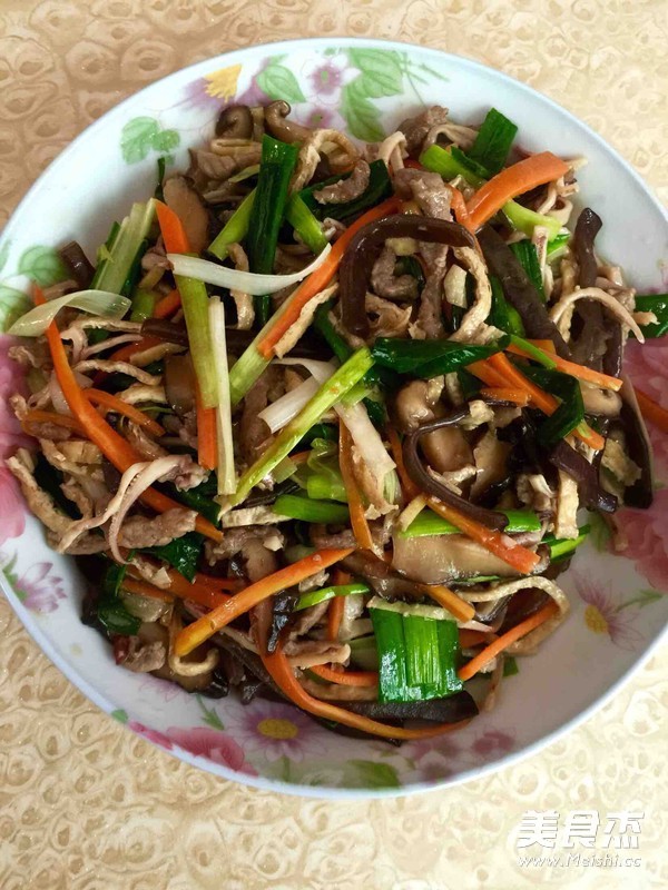1.木耳、香菇泡发切丝,猪里脊切丝,胡萝卜、豆干、鱿鱼干切丝,蒜苗切段。