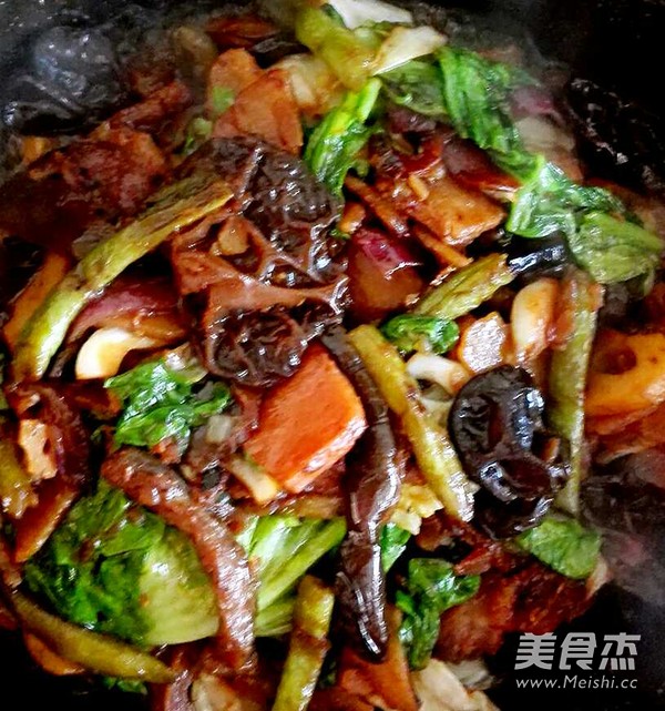 10.依次加入藕片翻炒,土豆片翻炒,豆角翻炒,木耳翻炒,茄子翻炒,大头菜翻炒,生菜翻炒。加入耗油,翻炒均匀。盖上锅盖小火焖3分钟。打开盖子,淋花椒油,香油,翻炒均匀盛盘!