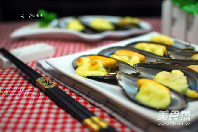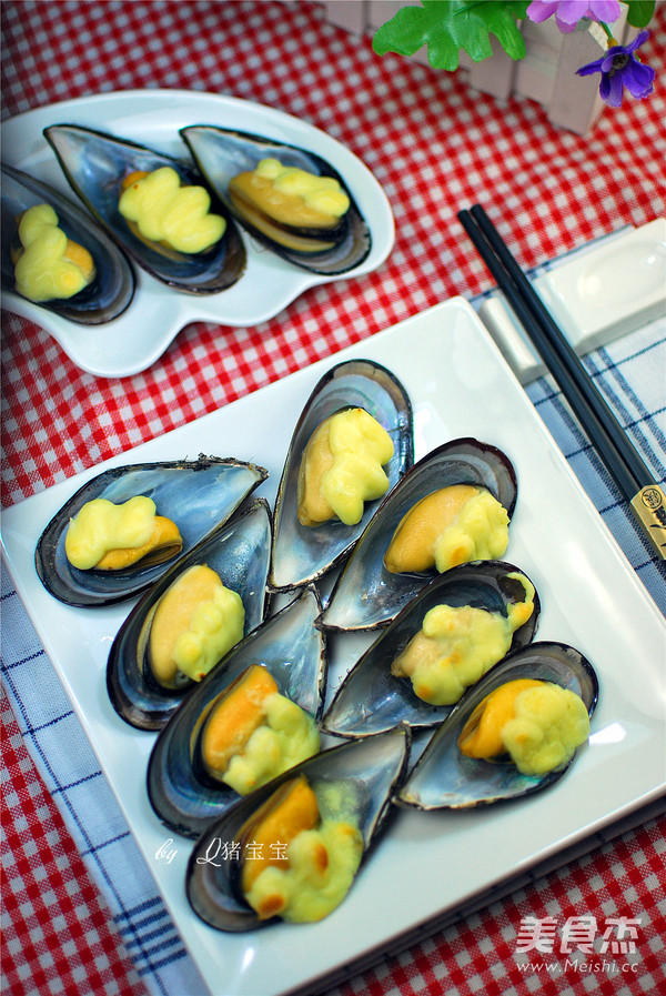 7.将调好的酱料挤到青口上,然后放入烤箱中层220度上下火烘烤10~12分钟即可。