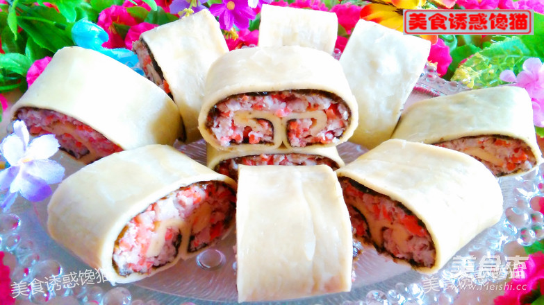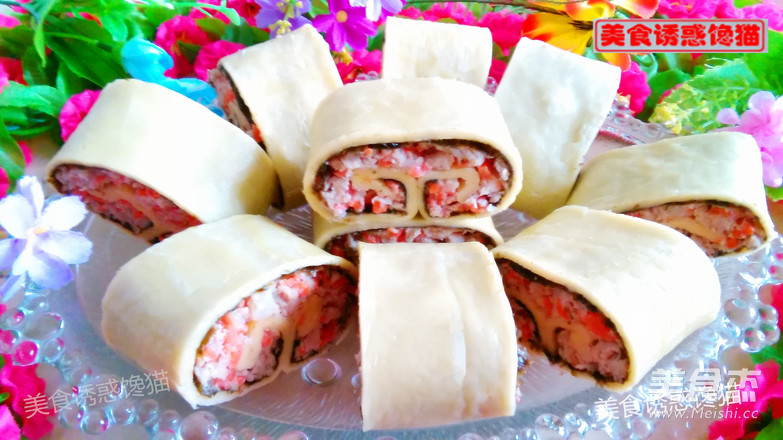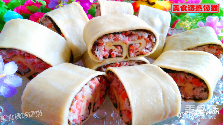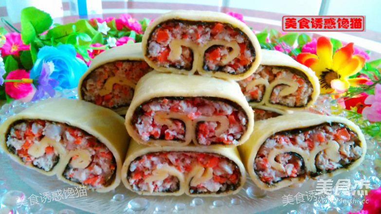 本款黄金如意肉卷,用蛋皮卷肉馅,卷成“如意”形状,无论是外形、寓意,还是口味,都是一道不错的美食。金灿灿的蛋皮喻为黄金满仓,“如意”形状喻为万事如意。咬一口,满口留香,蒸好切块,或直接入口,或浇入汤汁,都不失为美味佳肴。记得,小时候最喜欢看妈妈做蛋皮,因为以前没有不粘锅,第一张蛋皮总是会破掉,而我就馋巴巴地站在边上等着吃第一张蛋皮。结婚后,我接过了妈妈的“大勺”,常做这道美食,每次都做很多,拿去孝敬二家的老人,祝福家人幸福安康、万事如意!
