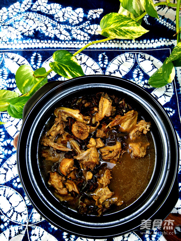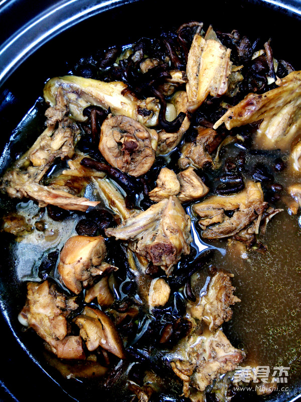 7.加入榛蘑,小火炖至鸡肉熟烂,榛蘑饱吸汤汁即可。鸡肉很容易熟,一开始放盐就可以,能更早入味。汤汁要留一些拌饭吃