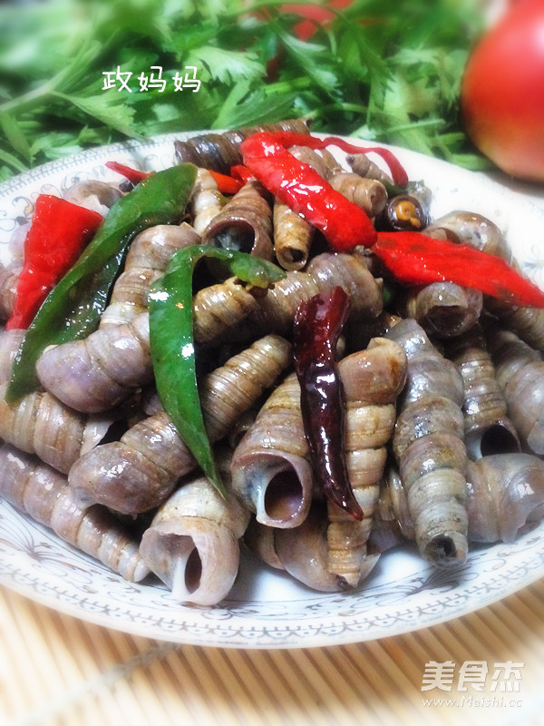 6.加入味极鲜酱油,盐继续翻炒,盖盖焖2分钟,取出一个能吸出螺肉来就可以了