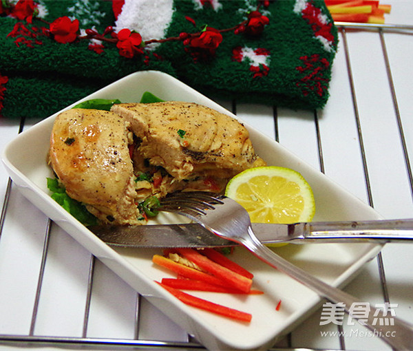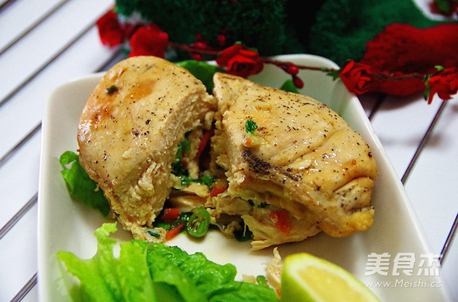 4.鸡胸肉擦干水分,中间切开成口袋状,把拌好的辣椒和香菜末塞进去,再小心的合拢来