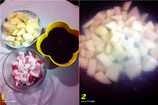 1、带皮五花肉事先处理干净,切成小方块。土豆去皮,洗净,切成块状,生抽、老抽、豆瓣酱、白糖调成料汁备用。