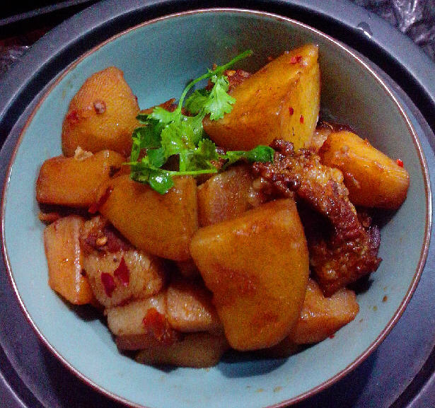 4、电饭煲洗净,放五花肉,八角,姜丝,土豆,调好的料汁煮至收汁即可,装盘,撒葱花。