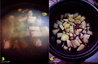 3、土豆捞起后,放姜片,五花肉大火烧开,煮至八分熟起锅,这期间把锅里的浮沫去掉。
