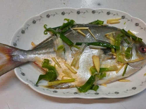 1、金鲳鱼退冰洗净后,用米酒、姜、葱腌约10分钟。