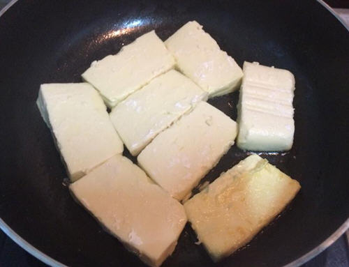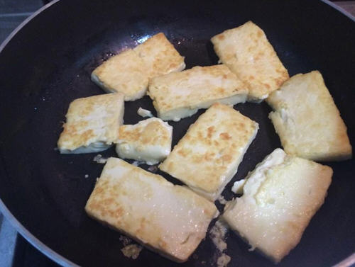 2、煎豆腐:将鸡蛋豆腐切块约1-1.5公分厚、然后将豆腐两面沾少许面粉、起油锅下锅煎。