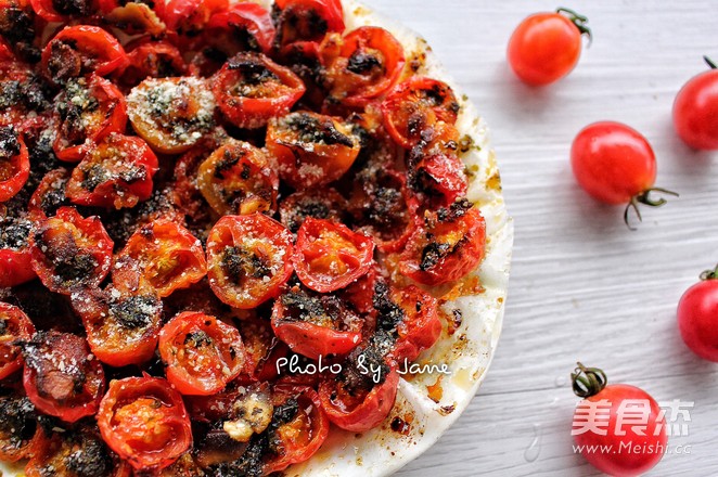 1.蕃茄切半摆放整齐在能入烤箱的盆里。