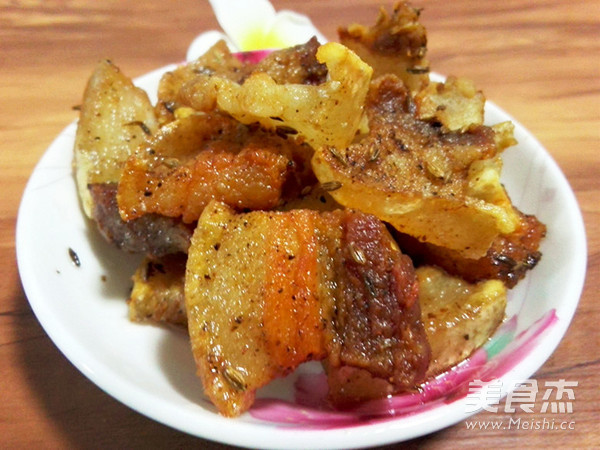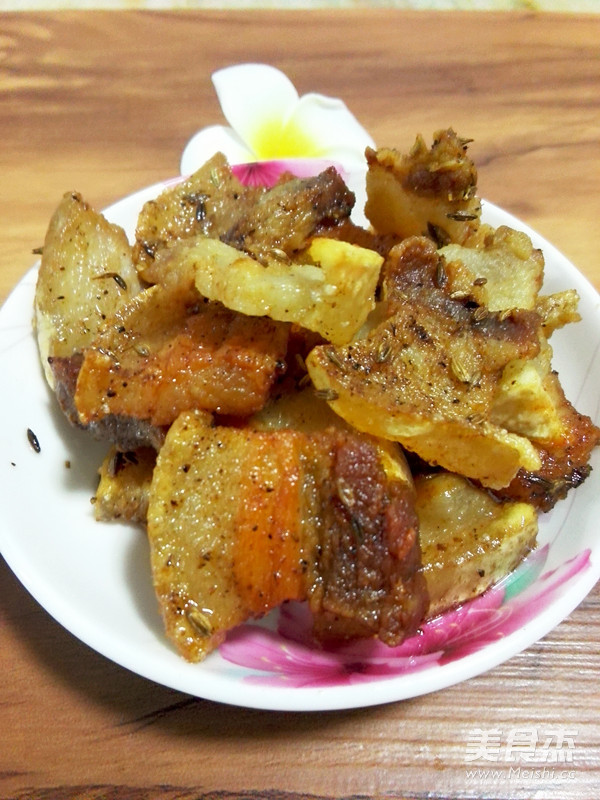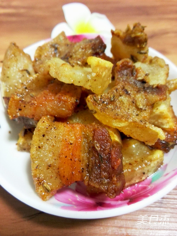 3.把五花肉均匀的放入锅中,撒上孜然粉和黑胡椒粉煎