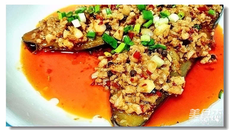11.将肉末铲在茄子面上,洒葱颗即可