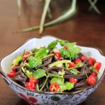 “蕨根粉”是从野生蕨菜的根里提炼出来的淀粉类做成的粉丝食品。因为蕨菜的根是紫色的,所以做出的粉丝也就成了“黑粉丝”。蕨根粉是一种药食同源的天然野生植物,即可入药又可食用,富含铁,锌,硒等多种微量元素和维生素及多种必需氨基酸。
