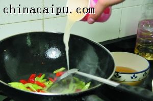 调料:油(3汤匙)、盐(1/5汤匙)、鸡粉(1/3汤匙)、生粉水(1/4杯)