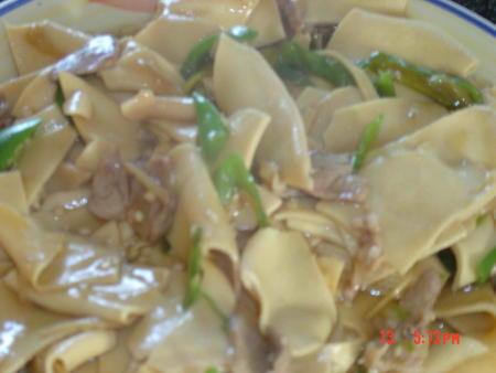 2.倒油适量,8成热时放入肉、葱花、姜丝一起炒,肉变色时放少许料酒和酱油,再倒入尖椒翻炒,辣味出来后放入切好的干豆腐,翻炒几下后放入适量盐和味精调味,再放入1碗半的鸡汤(水也行,我这是正好有,碗就是普通的饭碗,途中装肉的的那个),搅拌均匀炖一小下,因为干豆腐比较干,炖一下好入味,汤收的差不多后勾一点浓芡翻一下就可以出锅了.