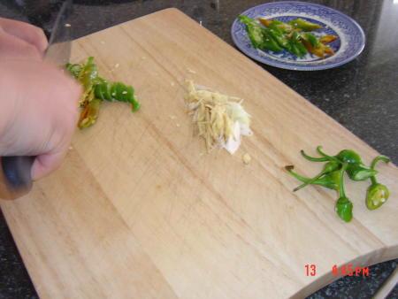 配料:尖椒(越辣越好)适量,葱(葱花).姜一点(切姜丝),猪肉一小块(见下图)