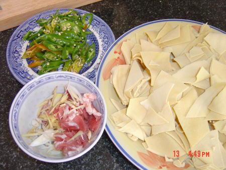 1.干豆腐切菱形块,肉切小薄片(一点就够),葱花、姜丝,尖椒斜刀切菱形块