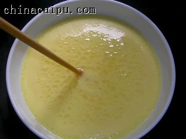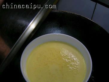 2.锅里放入蒸隔架,加水烧沸,蛋汁里加约五十度的热纯净水和油搅匀,放在蒸架上加盖,用中大火蒸。