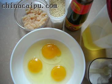 用料:鸡蛋三个打碗里加一咖啡匙盐充分搅打,瘦肉末约一两,喜欢加香葱的人可用两棵切碎,油两匙(如果是化猪油就只需一匙)蚝油两大匙,熟白芝麻适量。