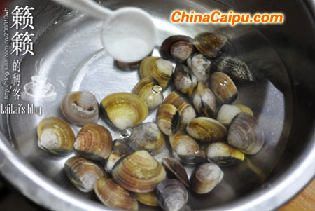 文蛤的前期处理:文蛤是海产品,蛤壳内会残留一些泥沙。所以买回来的蛤类,冲洗干净后将其放入盆中,添加足量清水,滴几滴油,加小勺盐搅匀,将盆放置背光处2小时即可。烹饪之前,将蛤壳用小毛刷刷洗干净。