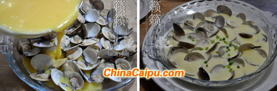 5-6.将混合蛋液倒入蒸盘中;锅内坐水煮开放入蒸盘,待蛋液边缘见白时转小火加盖蒸制;蛋液蒸熟后(约8分钟,可用竹签插试把握生熟度),将蒸钵取出,撒上葱末,点上少许蒸鱼豉油、香麻油,上桌乘热食用。