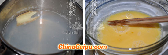 3-4.锅内煮蛤的水撇去上层浮沫,沥出中段水,摊凉备用(锅中底层水中会有少许杂质沉淀,弃之不用);鸡蛋去壳打散,将温蛤水徐徐倒入打散的蛋液中(蛋液与温水比例约为1:1,蒸出来的蛋块带有点小弹牙,如果喜欢更水嫩口感,可以加大温水的比重),调入少许糖、盐,搅打均匀;