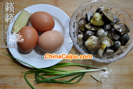材料:鸡蛋3只、文蛤(300g左右)、生姜1块、小葱2根(主要材料如↓图所示)