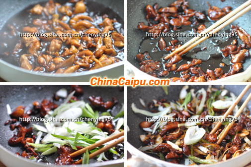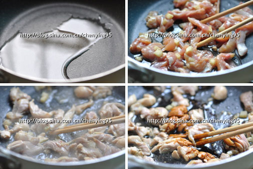 2、 开火,将腌制好的鸡肉放入拌炒