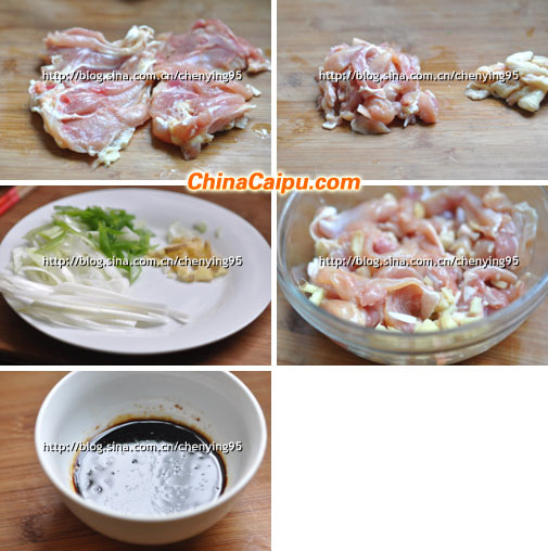 5、 鸡肉切小长条,放老姜、料酒腌制一会会