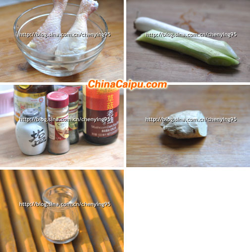 用到了:琵琶腿两个、老抽、生抽、白糖、白芝麻、料酒、肉桂粉(选用)、大葱、老姜、盐(没用,哈哈)