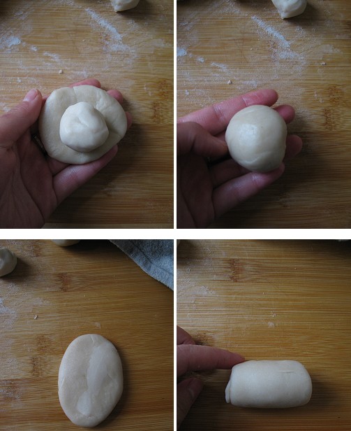 3.包好面团轻轻按扁擀成长条,从一头卷起,然后再次按扁擀成长条、卷起,最后整理成圆团;