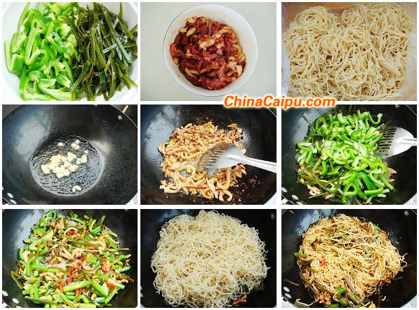 1、肉丝用料酒和酱油腌10分钟。青红椒洗净切条儿,海带丝洗干净备用。