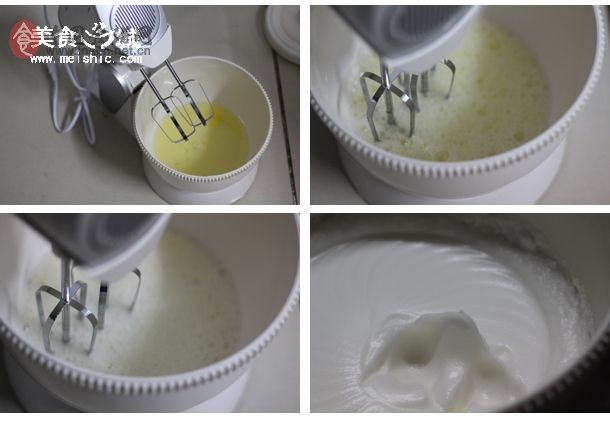 2、先打发蛋白,蛋黄放一边备用。用打蛋器把蛋白打到呈鱼眼泡状的时候,加入1/3的细砂糖(20克),继续搅打到蛋白开始变浓稠,呈较细腻泡沫时,再加入1/3糖。到蛋白比较浓稠,表面出现纹路的时候,加入剩下的1/3糖。