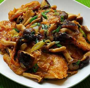 5、锅中放入适量油爆香葱蒜碎,放入各种蘑菇翻炒均匀,依次加入适量的水、浓汤宝、炸好的豆腐翻炒至入味,最后调入蚝油和蒜苗碎即可。